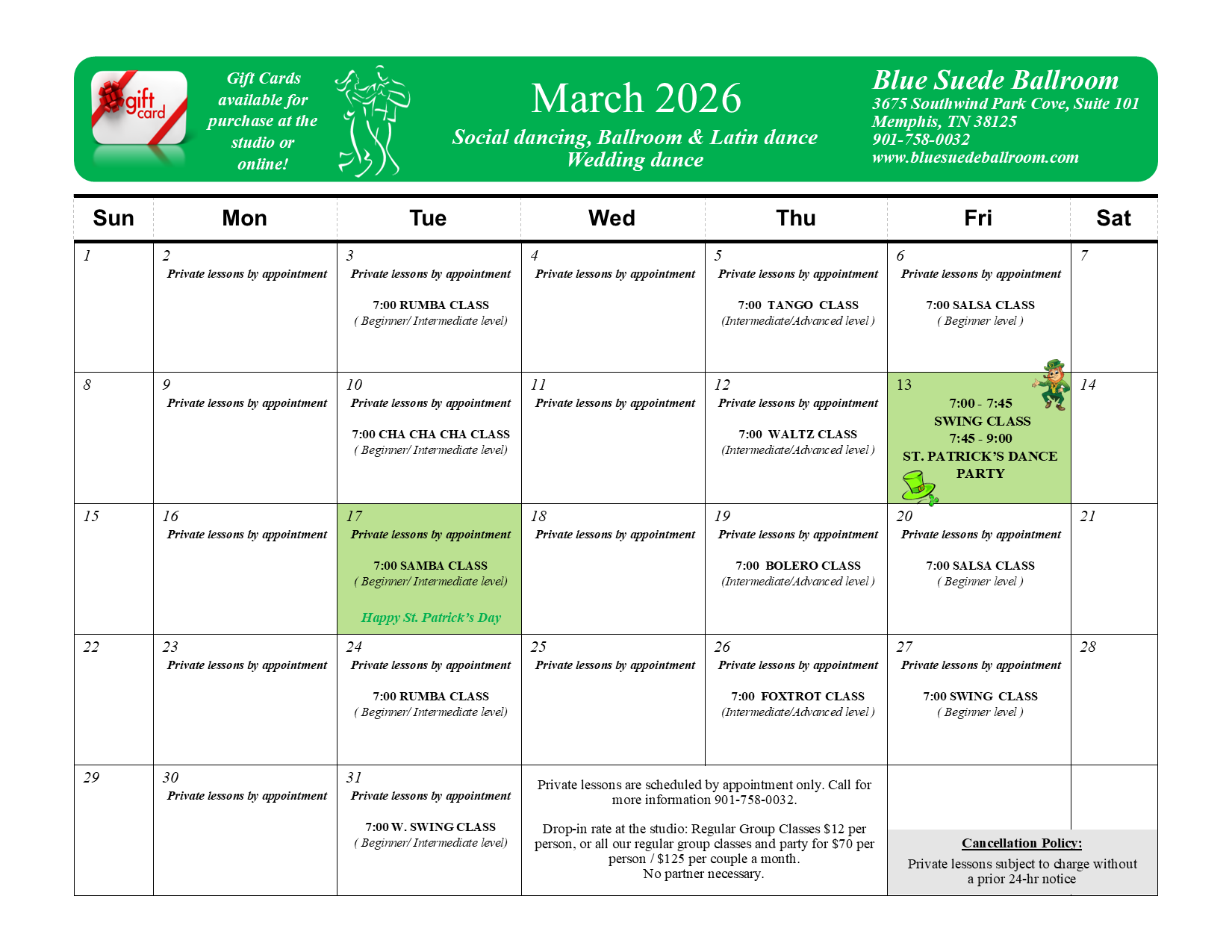 Blue Suede Ballroom offers private dance lessons and group classes. Schedule your private dance lesson today (901) 758-0032!